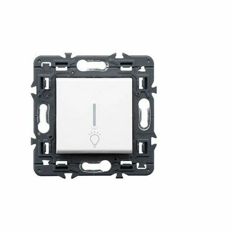 Valena Next Leuchtdrucktaster mit 6 A – 230 V Lampensymbol. Automatische Terminals. Lichtfunktion mit LED-Lampe (230 Vac – 0,15 mA) Art.-Nr. 0 676 86 und Pilotfunktion mit LED-Lampe (230 Vac – 3 mA) Art.-Nr. 0 676 85, weiß. Valena Next Taster werden mit einer fertigen Front geliefert, die mit Zierplatten ausgestattet werden kann, Befestigung mit Schrauben oder Krallen.
