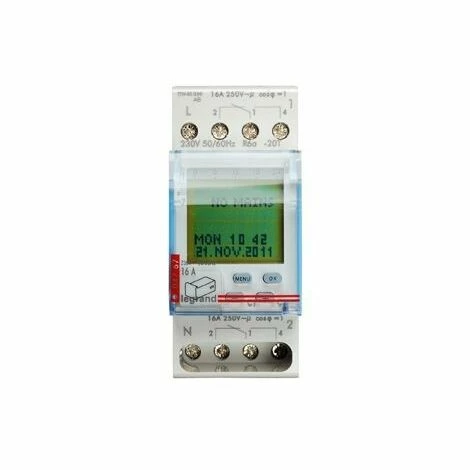 Digitaler Zeitschalter mit Programmierprinzip durch Textanzeige. Wahlmöglichkeit aus den folgenden Sprachen: Deutsch, Englisch, Französisch, Italienisch, Niederländisch, Spanisch. Programmierung auch mit Leichtigkeit über einen PC mit Software möglich Legrand AlphaSoft, ein Datenschlüssel und ein PC-Adapter. Möglichkeit, die Programmierung auf dem Datenschlüssel AlphaRex/AstroRex zu speichern, EEPROM Speicher für die Aufnahme von Vermittlungsprogrammen. Schaltzeiten sind als wöchentliches Programm auf dem Bildschirm sichtbar. Technische Merkmale:- Astronomische Berechnung von Sonnenaufgang und Sonnenuntergang Stunden- Mit kombinierter Funktion zur Erstellung von Schaltprogrammen- Direkte Steuerung von der Verteilertabelle, kein separater Lichtsensor erforderlich – Automatischer Übergang zum Sommer/Winter- Ferienprogramm- 28 Programme- Betriebsgenauigkeit: ± 0,1 s/Tag- Manuelle schaltbare Abdeckung, auch wenn der Datenschlüssel angeschlossen ist- Mindestschaltzeit: 1 min- Leistungsreserve 5 Jahre für Datum und Uhrzeit Betriebstemperatur: -20°C … +55°C- Mit Vorteilen des Lexic-Systems Nach EN 60730-1 und 60730-2-7, AstroRex3 D21- 56 Programme- 1 Inverser 250 V, 50 Hz, 16 A- Mit Steuereingang, Zeitdauer 0 min – 23 h 59 min- AstroRex3 D22- 28 Programme pro Kanal- 2 Inverser 250 V, 50 Hz, 16 A