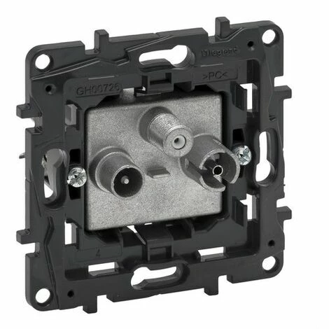 Fernsehbasis TV- R -SAT – Mittelstufe – Zur Verbreitung von Fernseh- und Radiosignalen – Alle Arten von Betreibern (DTT, Kabel, Satellit) – Gemäß den europäischen Richtlinien EN 50083-4 und EN 50083-2 – Kompatibilität mit HDTV und LTE-Netze – Abgeschirmte Basen zur Vermeidung von Interferenzen mit 3G- und 4G-Mobilfunknetzen – Fernseher: Stecker (9,5 mm) – R: Buchse (9,5 mm) – SAT: Stecker vom Typ «F» – Kabel empfohlen Koaxial: 17/19 VATC – Frequenzband: -TV: 5-68/120-862 MHz – R: 87,5-108 MHz – SAT: 950-2400 MHz – Dämpfung unter 14 dB – Ausstattung mit Frontplatte und Verkleidung – Unterputz- oder Oberflächenmontage – Befestigung mit Schrauben oder Krallen (im Lieferumfang des Mechanismus enthalten) – Lieferung mit Kunststoffschutz zum Schutz während der Installation