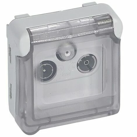 Graue TV-R-SAT I/O PLEXO-Buchse. TV-R-SAT-Basis – Niedrige Intensitätsbasis mit einer Dämpfung von weniger als 1,5 dB – Sprachausgabe über TV-Anschluss – TV: 5-68 und 120-862 MHz – FM: 87,5-108 MHz – SAT 950 – 2400 MHz – Grau. Plexo – IP 55 wasserdichte Mechanismen – zusammensetzbar – VDI-Sockel und Adapter.