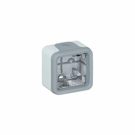 Einfache PLEXO-Aufputzbox für 1 graue Mechanik. Kästen mit Kegeln 1 Element – Zugang zu den Befestigungen des Kastens mit montierten Kegeln – Kegel mit Membran, abnehmbar, bohrbar ohne Schneiden 1 Element – 1 oberer Kegel, 1 Einlass – 1 unterer Kegel, 1 Auslass – Grau. Plexo – Wasserdichte Mechanismen IP 55 – Modular – Aufputz – Boxen und Halterungen für Platten – Boxen und Halterungen mit Abschlussfront enthalten – Geräuschvolles Klicken, um sicherzustellen, dass die Platte richtig befestigt wurde – Sie lassen modulare Mechanismen zu – Boxen, die mit einem Terminal ausgestattet werden können automatischer Nylbloc-Anschluss, 2 Leiter für einen möglichen zusätzlichen Anschluss – IP 55 – IK 07.