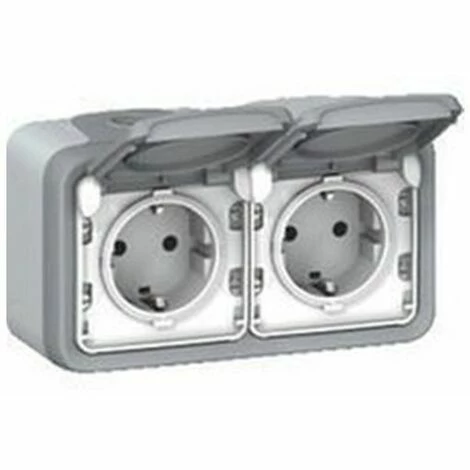 Mechanismus PLEXO MBLOC doppelt 2 Pole + horizontale Erde. Stromsteckdosen – Grau – 16 A – 250 V~~ – 2x2P+E mit seitlichem Schutzkontakt – Schraubklemmen – Waagrechte Montage. Plexo – Wasserdichte Mechanismen IP 55 – Monoblock – Aufputz – Stromsteckdosen – Wird komplett mit 2 Konen geliefert – Platte ohne Befestigung.