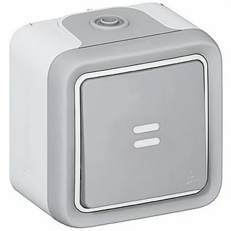 MBLOC PLEXO Flächenlichtschalter. 10 AX-Schalter – 250 V – IP 55 – IK 07 – Automatischer Klemmenanschluss – Leuchtender Schalter – Inklusive 230-V-Lampe – Grau. Plexo – IP 55 wasserdichte Mechanismen – Monoblock – Aufputz – Schalter, Drucktasten und automatische Schalter – Lieferung komplett mit 2 Kegeln – Platte ohne Befestigung.