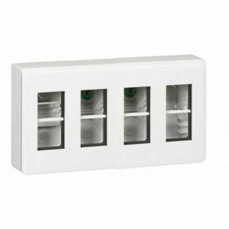 Surface-Workstation-Boxen. Installation mit versenkten oder Aufputzrohren und Formteilen oder Kanälen. Ausgestattet mit:. Gehäuse zur Aufputzmontage mit abnehmbaren Eingängen (oben/unten und an den Seiten), vorgeschnitten für 40 x 20 Zierleisten 4-Modul-Einzelhalterungen für die werkzeuglose Installation von Mosaic-Programmmechanismen (mit 2 optionalen Schrauben geliefert). Abnehmbarer Abstandshalter für die Installation von 1-Modul-Mechanismen. Trennwand für Strom und Daten Für 4 x 4 Module Weiß
