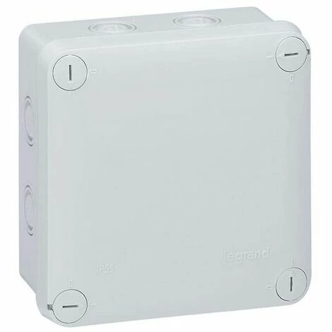Legrand Abzweigdose Plexo, Quadratisch 105 x 105 x 55 mm (H x B x T), Schutzart IP 55 – IK 07, mit Vorprägung für metrische Leitungseinführung, Deckel mit 1/4-Drehung Schnellverschluss, Lichtgrau RAL 7035, selbstverlöschend 650°C, Beschriftbarer