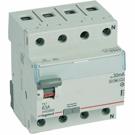Fehlerstromschutzschalter Serie TX3. Typ A, für Wechsel- und pulsierende Gleichfehlerströme. Anbau von Hilfsgeräten möglich, Befestigung auf Hutprofilschiene EN 60715 durch rastende Schnellbefestigungen, eindeutige Schaltstellungsanzeige rot/grün am Schalthebel, mit Untersteckschutz zum sicheren Einführen des Leiters in Fahrstuhlklemme.