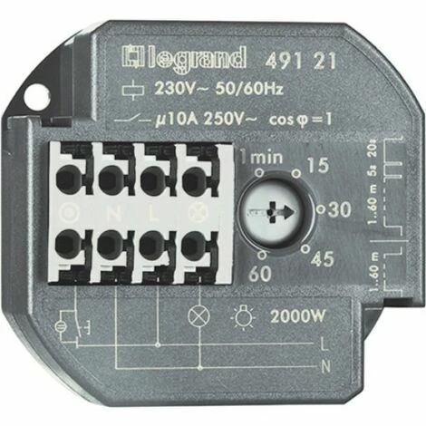 Treppenlichtzeitschalter, zum Einbau in Unterputz-Dose, 1-polig, 10 A/ 250 VAC, elektronisch, Steuerspannung AC 230 V, 1 Schließer, sehr geringes Schaltgeräusch, Zeitbereich: 1 – 60 Min., jederzeit nachschaltbar, mit aktiver Vorwarnfunktion (an seitlichem Einstellschalter zuschaltbar), Nulldurchgangsschaltung, Glimmlampenstrom max. 50 mA, Eigenverbrauch 0,8 W, Schraubenlose Anschlussklemmen, Schutzklasse IP 20, Abmessung: 49 x 46 x 26 mm (Höhe x Breite x Tiefe).