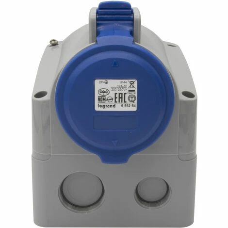 Steckdose SUPERCOMPACT 32A 2 Pole 250V IP44. Aufputz-Wandsteckdosen – Mögliche Winkel 5 oder 25° je nach Einbaurichtung der Dose – Werkzeugloses Schließen – Einzelorientierung der Anschlussschrauben – Lieferung ohne Blockierung – Blau 200/250 V – 2P T – 32 A. P17 PRO – Industriesteckdosen und -stecker – Entspricht EN 60309-1 und 2 – IP44 gemäß EN 60529 – IK 09 (außer Wandsteckdose IK 08) gemäß EN 62262 – Material: Polyamid 6 – Selbstverlöschend: 850 °C (Teile in Kontakt mit spannungsführenden Teilen) / 650ºC (Körper).