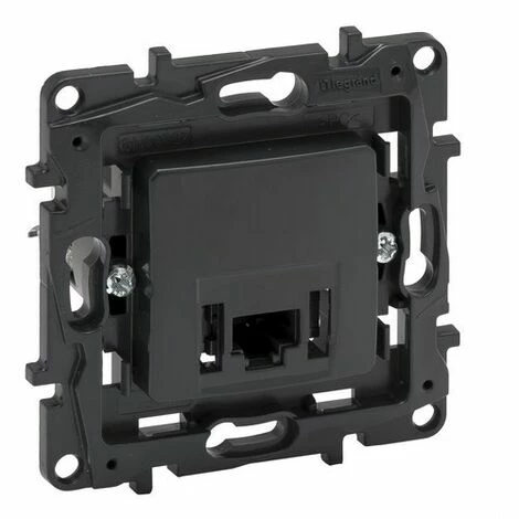 Telefon- und Computer-Basis RJ 45 – Kat.6 – UTP – individuell – Abhängig von der durchgeführten Verkabelung kann sie zur Übertragung von Audio oder Daten verwendet werden. – Mit einem Schlüssel und einer Endverkleidungsplatte auszustatten. – Unterputz- oder Oberflächenmontage. – Befestigung mit Schrauben oder Krallen (im Lieferumfang des Mechanismus enthalten) – Zum Schutz während der Installation mit Kunststoffschutz geliefert