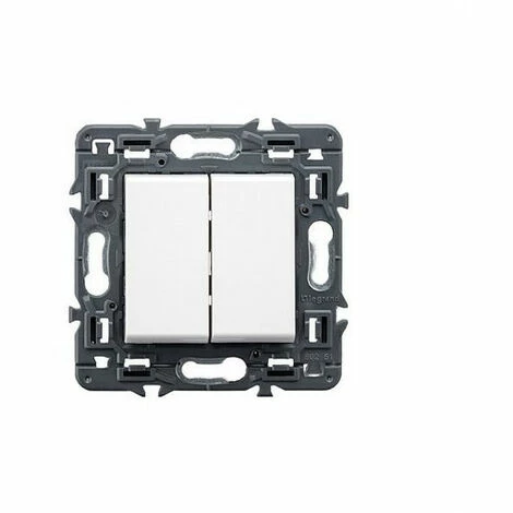 Valena Next einpoliger Doppelschalter 10 AX – 230 V. Automatische Terminals, weiß. Valena Next Beleuchtungsmechanismen werden mit einer fertigen Front geliefert, die mit Zierplatten ausgestattet werden kann, Befestigung mit Schrauben oder Krallen.